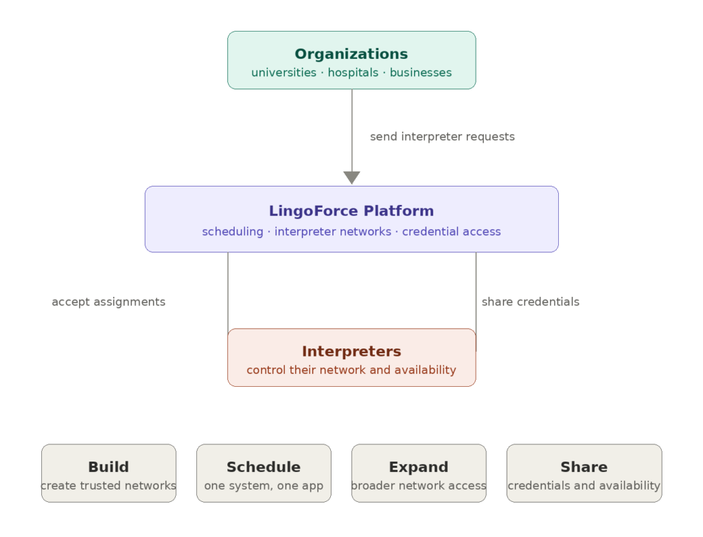 LingoForce is a centralized platform where organizations and interpreters build trusted networks, coordinate assignments, and verify credentials while ensuring communication access.